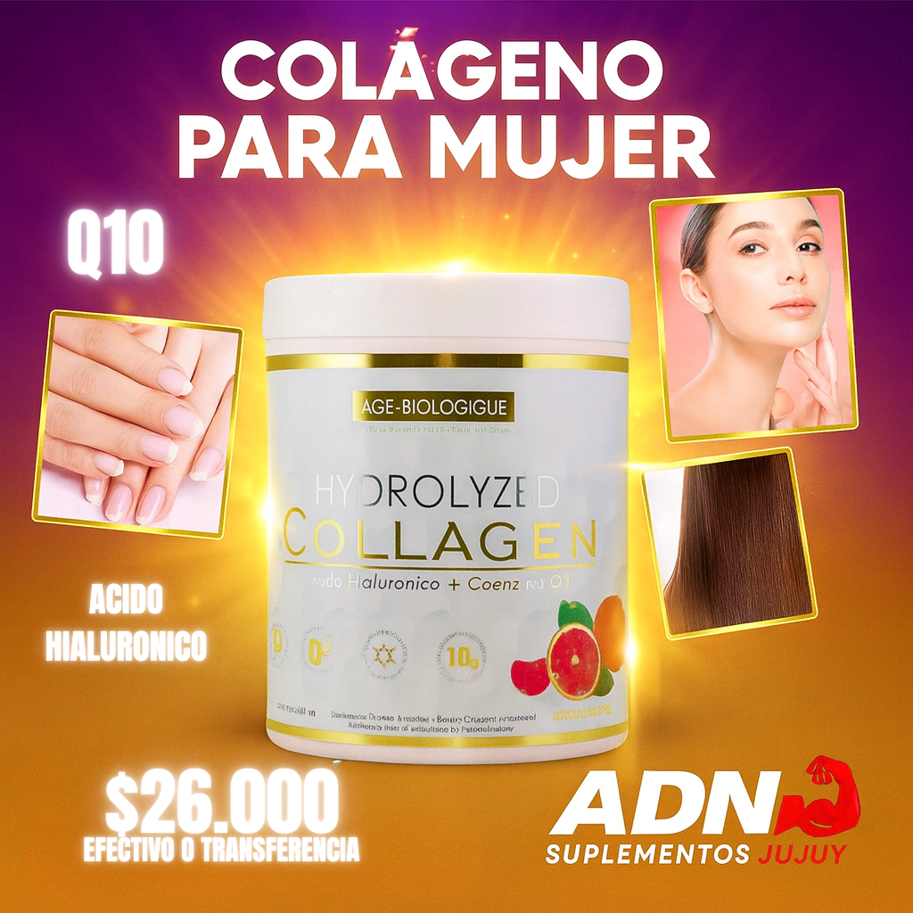 COLAGENO AGE BIOLOGIQUE + Q10 + ÁCIDO HIALURÓNICO es un suplemento avanzado diseñado para mejorar la salud de tu piel y articulaciones. Su fórmula combina colágeno hidrolizado, coenzima Q10 y ácido hialurónico, ingredientes clave para promover la elasticidad, hidratación y regeneración celular.
